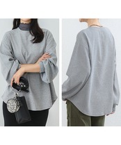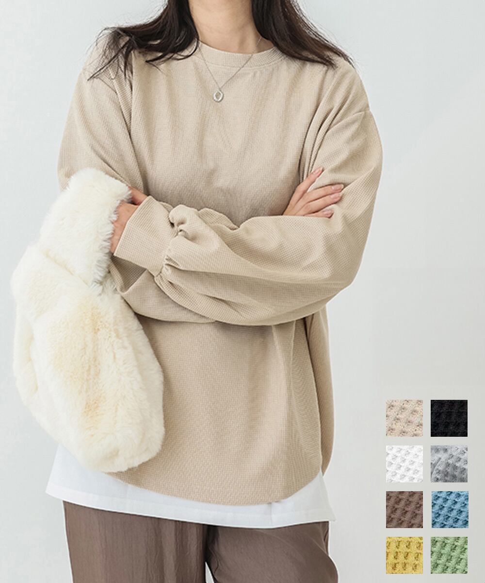 パフスリーブ 無地 トップス おしゃれ長袖プルオーバー 体型カバーカットソー ゆったり春秋服オルチャン ワッフル生地